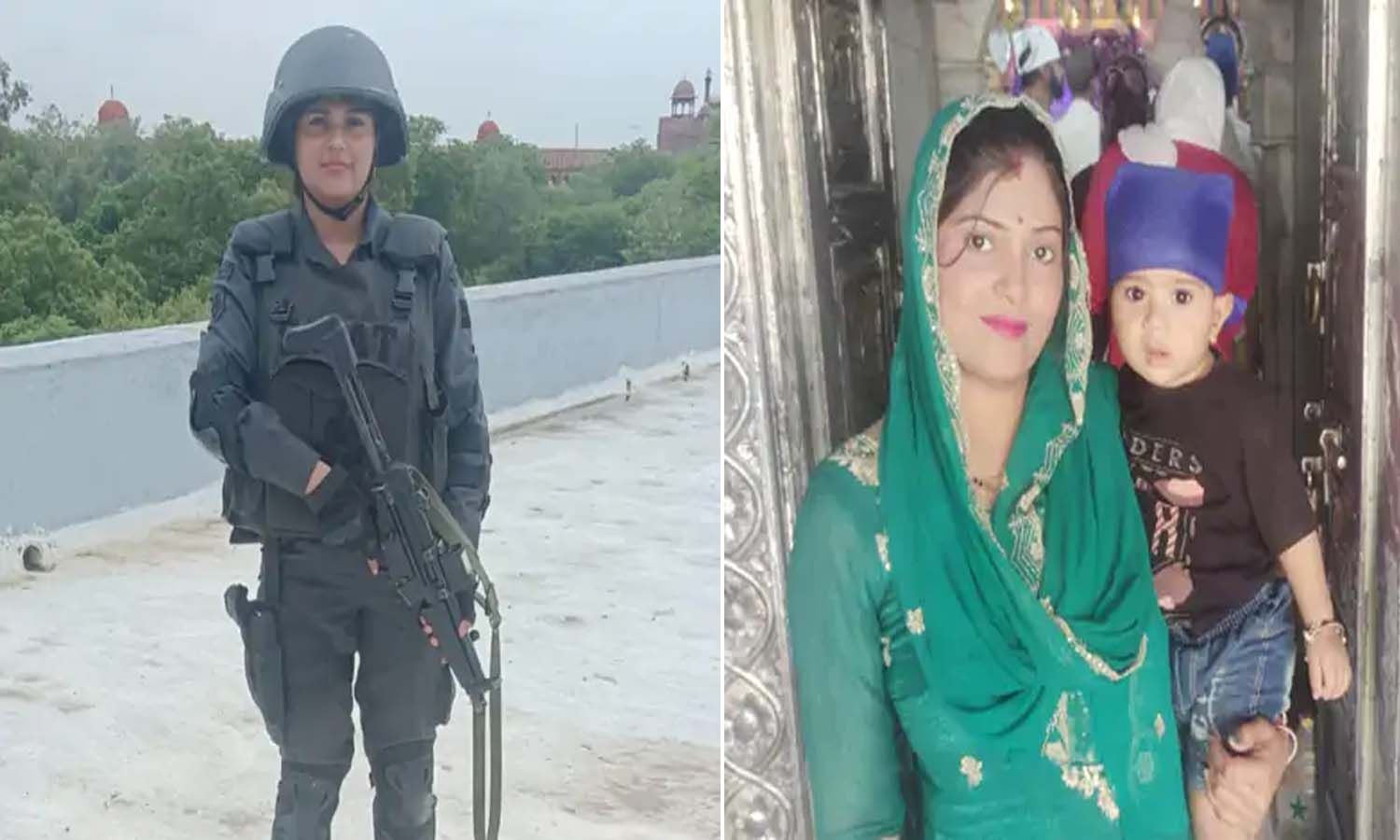 दिल्ली पुलिस की कमांडो काजल का फाइल फोटो व काजल अपने डेढ़ साल के बेटे के साथ।