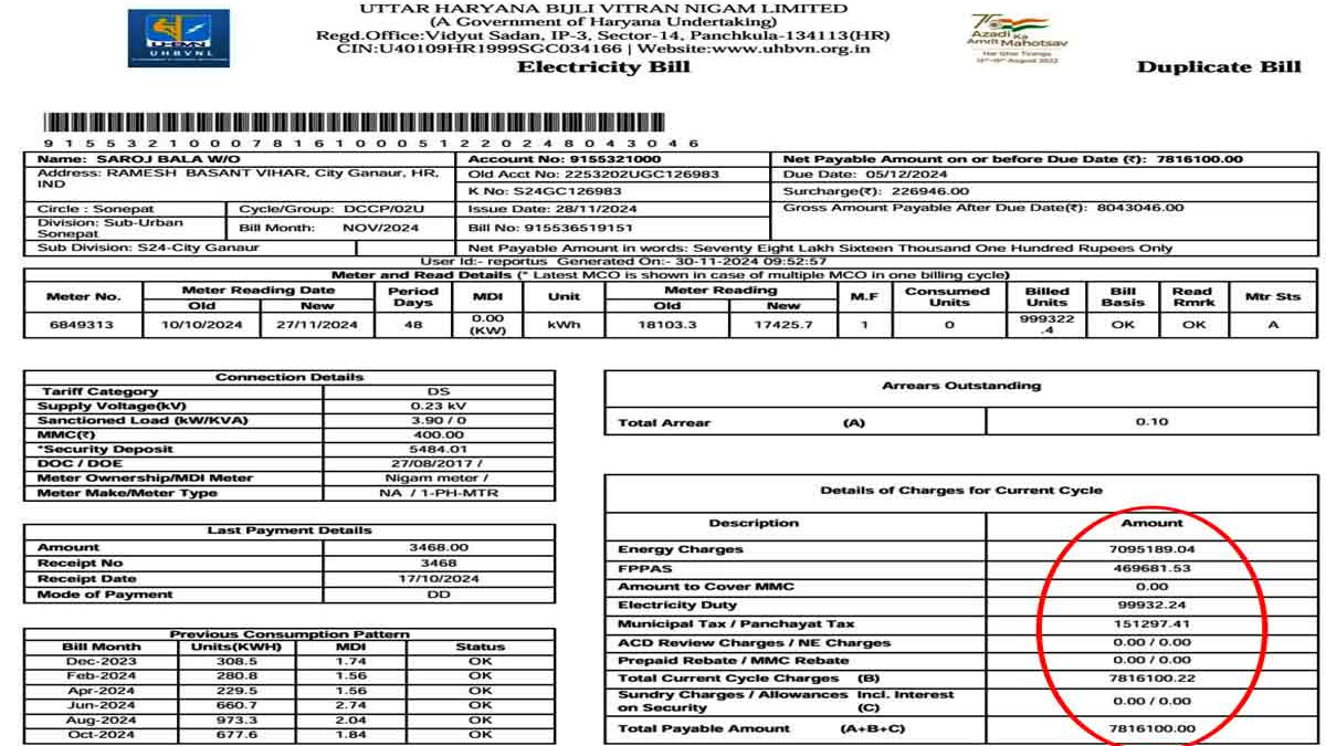 गन्नौर/सोनीपत: बिजली विभाग अक्सर अपने कारनामों के कारण चर्चा का विषय बना रहता हे। बिजली बिल (Electricity Bill) वितरण के बाद बिजली निगम की भारी लापरवाही देखने को मिली। बसंत विहार में एक घरेलू उपभोक्ता सरोज बाला के नाम 78 लाख 16 हजार 100 रुपए का बिजली बिल भेजा गया है। बिल में 9,99,322 यूनिट खपत दिखाई गई है, जो घरेलू उपभोक्ता के लिए असंभव है। बिल में लाखों रुपए के अतिरिक्त भारी भरकम शुल्क भी जोड़े गए हैं।