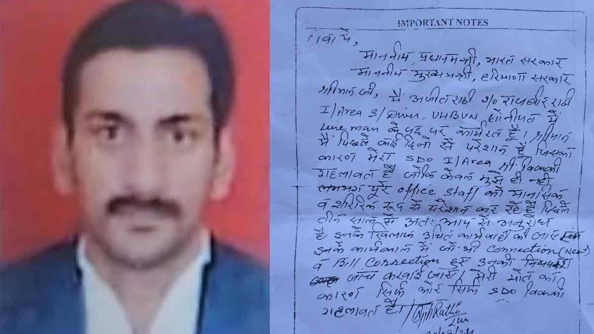 मृतक ने पीएम व सीएम के नाम सुसाइड नोट में लिखा कि मैं अजीत राठी इंडस्ट्रियल एरिया सब डिवीजन यूएचबीवीएन में लाइनमैन के पद पर कार्यरत हूं। मैं पिछले कई दिनों से परेशान हूं, जिसका कारण मेरा एसडीओ इंडस्ट्रियल एरिया विक्की गहलावत है, जो केवल मुझे ही नहीं लगभग पूरे ऑफिस स्टाफ को मानसिक व शारीरिक रूप से पिछले तीन साल से परेशान कर रहा हैं। अत: आप से अनुरोध है कि इनके खिलाफ उचित कार्यवाही की जाए एवं इनके कार्यकाल में जो भी कनेक्शन नए व बिल करेक्शन हुए हैं, उनकी निष्पक्ष जांच करवाई जाए। मेरी मौत का कारण सिर्फ और सिर्फ एसडीओ विक्की गहलावत है।