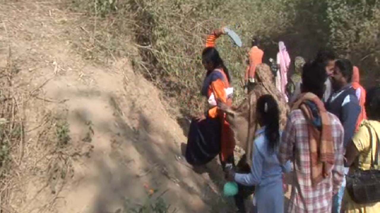 जरासंध के टीले पर जूते-चप्पल बरसाते लोग।