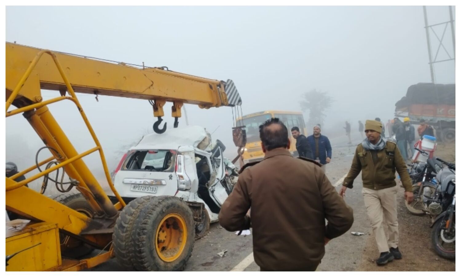 मध्य प्रदेश के ग्वालियर में घने कोहरे ने एक बार फिर कहर बरपाया है। शुक्रवार सुबह महाराजपुरा थाना क्षेत्र में हुए एक भीषण सड़क हादसे में दो महिलाओं समेत चार लोगों की दर्दनाक मौत हो गई। हादसा इतना भयावह था कि कार पूरी तरह चकनाचूर हो गई और मृतकों के शव गाड़ी से चिपक गए।