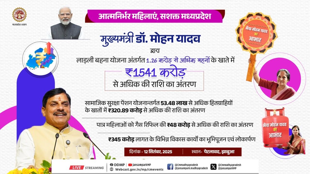 Ladli Behna September Installment: मध्यप्रदेश की करोड़ों महिलाओं के लिए आज का दिन बेहद खास होने जा रहा है। मुख्यमंत्री डॉ. मोहन यादव शुक्रवार को झाबुआ जिले के पेटलावद में राज्य स्तरीय कार्यक्रम से लाड़ली बहना योजना की 28वीं किश्त जारी करेंगे। इस दौरान 1.26 करोड़ से अधिक लाड़ली बहनों के खातों में 1541 करोड़ रुपए सिंगल क्लिक से ट्रांसफर किए जाएंगे।