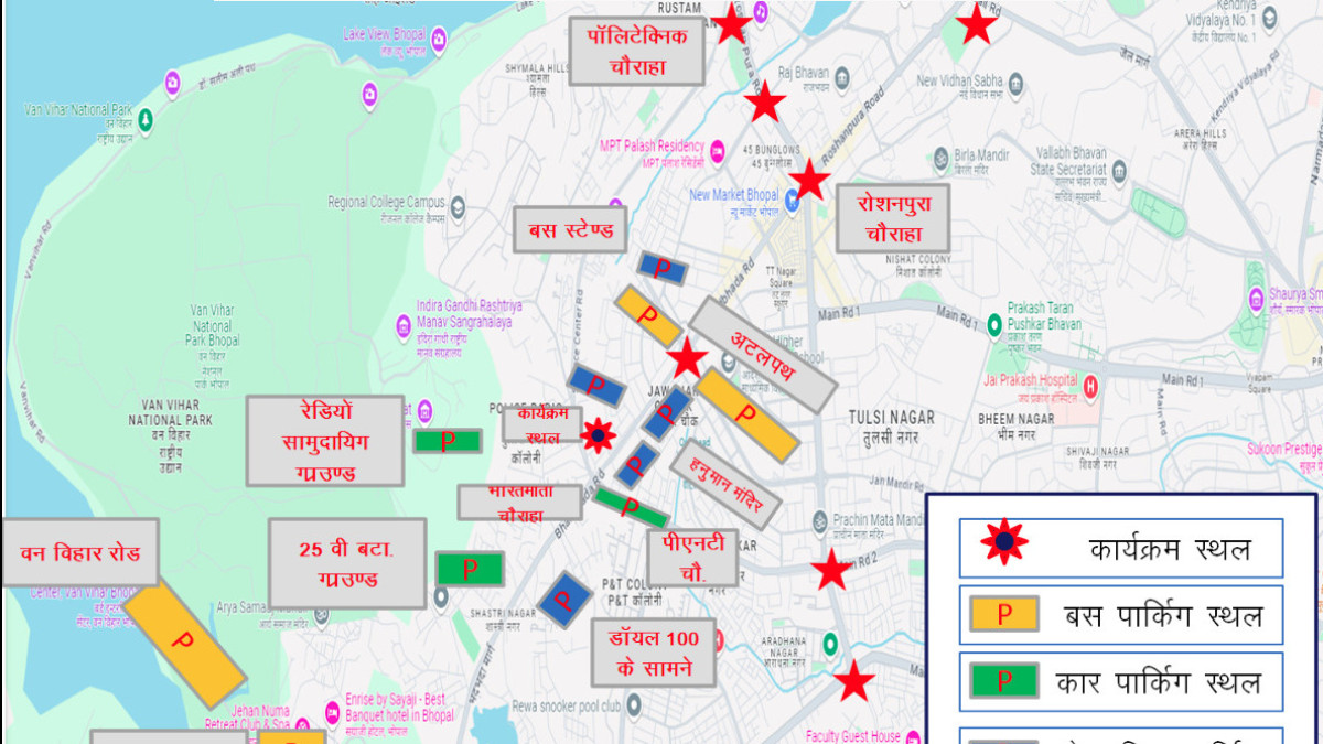 - मिसरोद, कोलार, एमपी नगर क्षेत्र से आने वाले प्लेटिनम प्लाजा से अटल पथ पर वाहन की पार्किंग कर पैदल कार्यक्रम स्थल पहुंच सकेंगें।