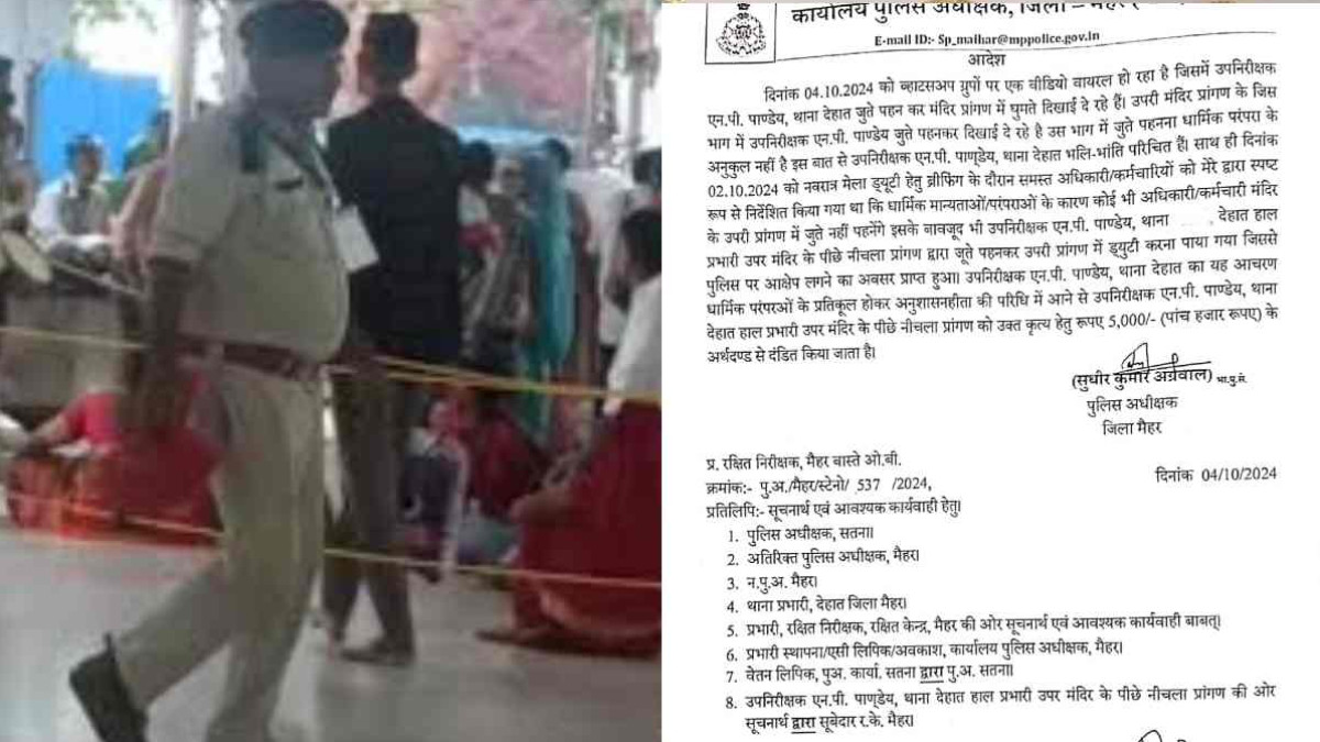 एमपी के मैहर में जूते पहनकर मंदिर में घूमना SI को महंगा पड़ा। मैहर एसपी ने पुलिस अफसर को अर्थदंड लगा कर दंडित किया है।