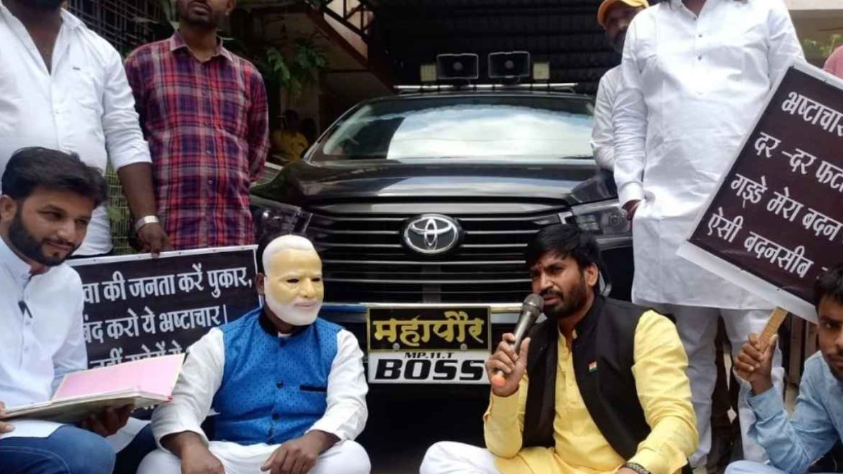 पीएम मोदी का मुखौटा लगाकर हंगामा