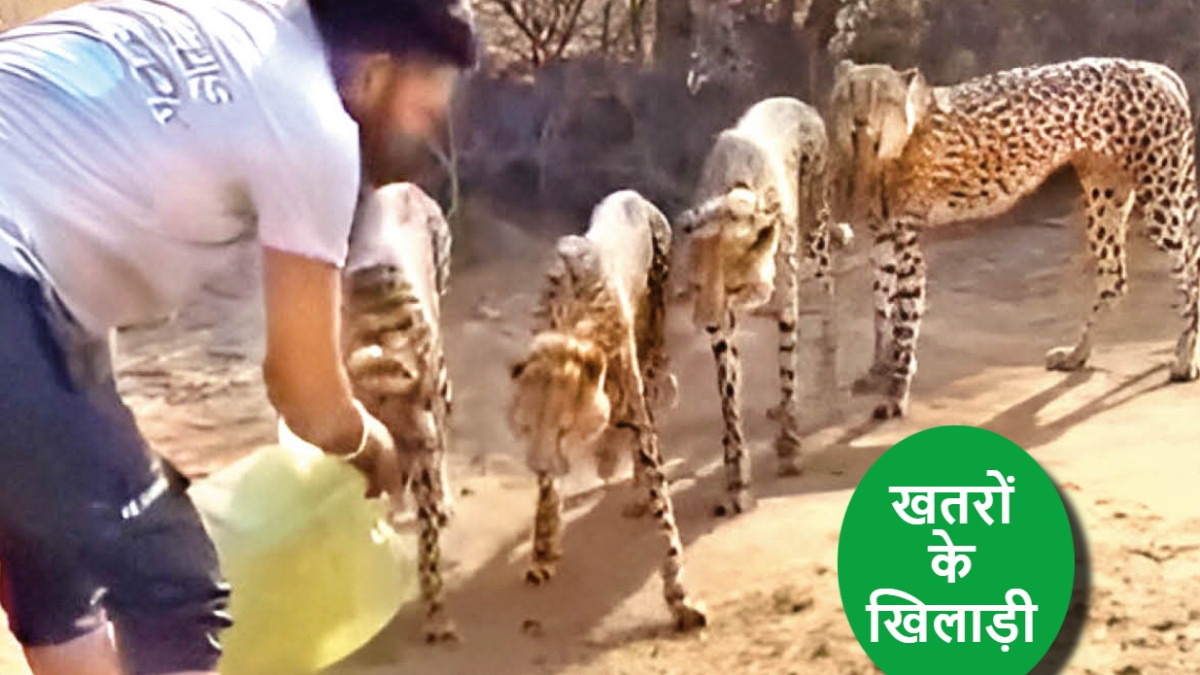 सत्यनारायण गुर्जर करीब डेढ़ मीटर दूर से चीतों को पानी दे रहे थे, लेकिन इस दौरान चीते उनके करीब पहुंच गए। कैमरे के पीछे कुछ लोग यह कहते भी सुने गए कि आओ, आओ...इस बीच चीते उठे और तुरंत गुर्जर के पास पहुंच गए। फिर वह प्लेट में पानी पीने लगे।