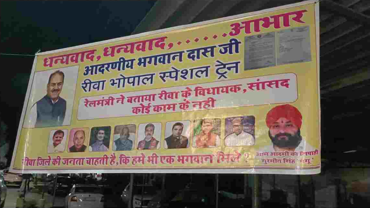 Rewa-Bhopla Train Poster Politics: मध्य प्रदेश के रीवा में स्पेशल ट्रेन को लेकर पोस्टर पॉलिटिक्स शुरू हो गई। शहर में पोस्टर लगाकर कुछ लोग स्थानीय सांसद-विधायकों का विरोध कर रहे हैं, जबकि, भोपाल विधायक भगवानदास सबनामी के प्रति आभार जताया है। पोस्टर में बताया गया कि रीवा के सांसद विधायक किसी काम के नहीं हैं। ट्रेन तक नहीं चलवा पाते।