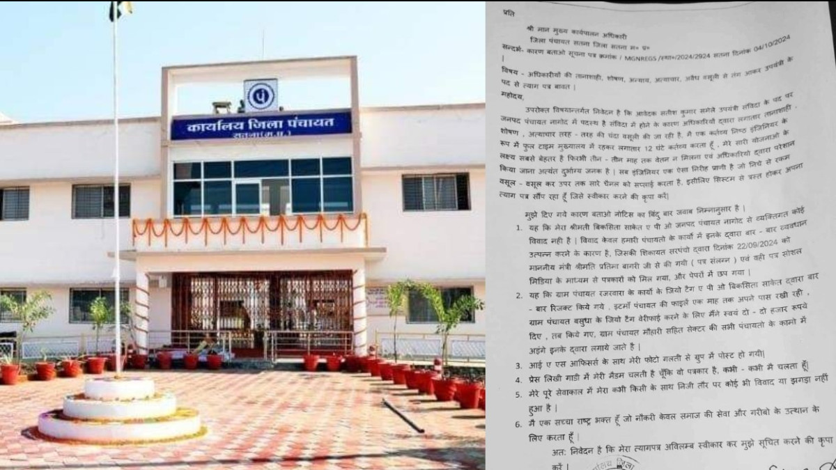 MP News: मध्य प्रदेश में सतना जिले नागौद जनपद में पदस्थ उपयंत्री सतीश समेले ने अवैध वसूली का आरोप लगाते हुए इस्तीफा दे दिया। उनके त्याग-पत्र से भोपाल तक हड़कंप है।