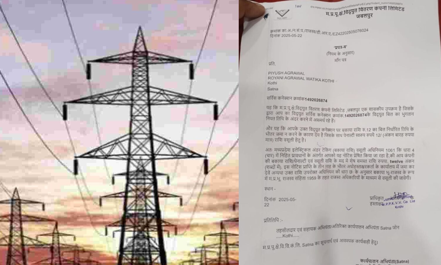 सतना जिले में बिजली विभाग एक अनोखे कारनामे को लेकर चर्चा में है। कोठी बिजली विभाग ने एक उपभोक्ता को मात्र ₹12 की बकाया राशि के लिए नोटिस जारी कर दिया।