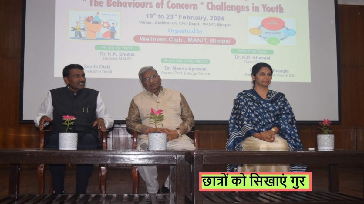 भोपाल। मौलाना आजाद नेशनल इंस्टीट्यूट ऑफ टेक्नोलॉजी (मैनिट) के वेलनेस क्लब ने ‘माइंडफुल इंजीनियरिंग: रेस्पॉन्डिंग टू द बिहेवियर ऑफ कंसर्न-चैलेंजेस इन यूथ’विषय पर एक सप्ताह की कार्यशाला का आयोजन किया, जिसमें छात्रों को उनके शारीरिक स्वास्थ्य के अलावा भावनात्मक और मानसिक स्वास्थ्य पर भी ध्यान देने को कहा गया। अपने समृद्ध अनुभव छात्रों से शेयर करने के लिए कार्यशाला में 7 विशेषज्ञ गणमान्य व्यक्तियों को आमंत्रित किया गया था।