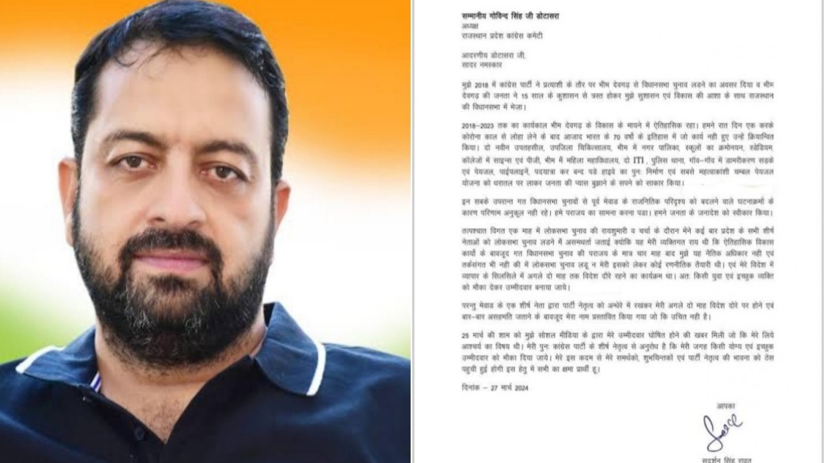 सुदर्शन सिंह रावत ने कांग्रेस प्रदेशाध्यक्ष गोविंद सिंह डोटासरा को एक पत्र लिखा है। जिसमें उन्होंने लिखा कि मेरी बिना सहमति के उम्मीदवार बनाया गया है। हालांकि रावत ने 2018 में कांग्रेस की टिकट पर भीम से चुनाव जीतने और विधायक रहते हुए किए गए कामों का जिक्र भी किया है। उन्होंने लिखा कि यह मेरी व्यक्तिगत राय थी, कि ऐतिहासिक विकास कार्यों के बावजूद पिछले विधानसभा चुनाव में हुई हार के चार महीने बाद ही लोकसभा लड़ने का नैतिक अधिकार नहीं है और न ही मेरी चुनाव लड़ने को लेकर कोई रणनीतिक तैयारी थी।
