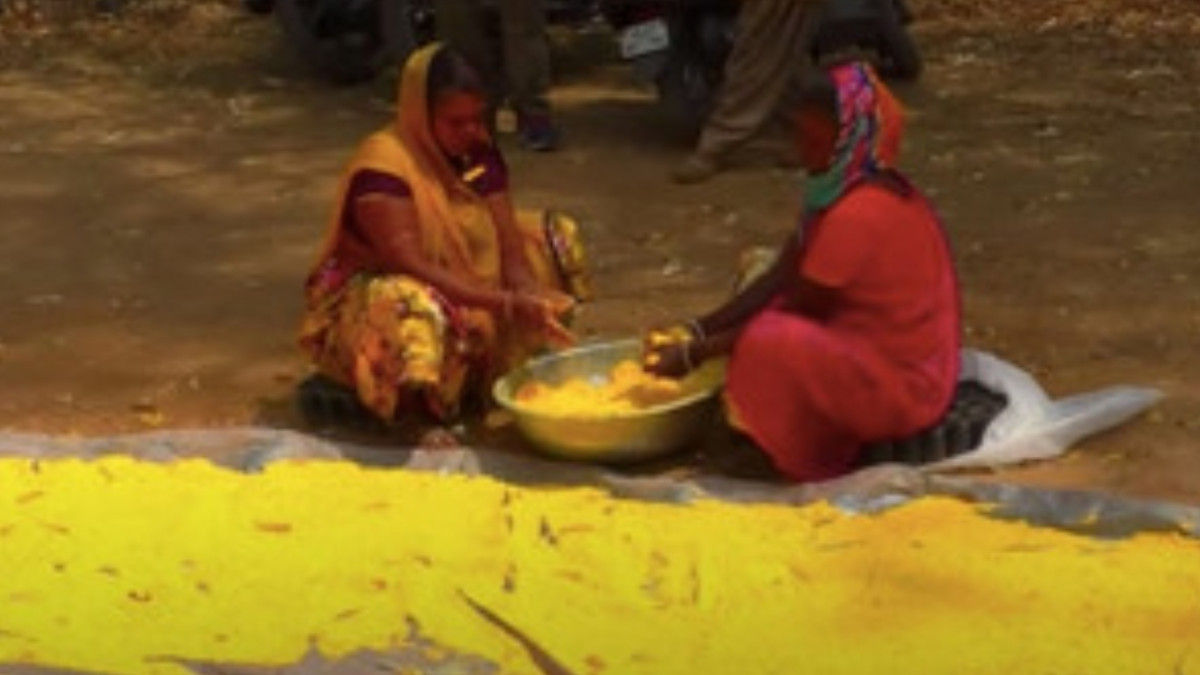 राजस्थान के सिरोही जिले के पिंडवाड़ा उपखंड के बसंतगढ़ क्षेत्र में आदिवासी महिलाएं प्राकृतिक गुलाल तैयार कर रही हैं।