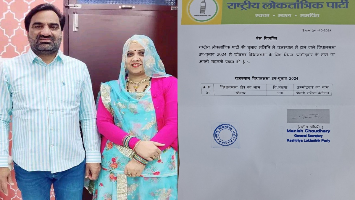 Rajasthan Vidhansabha By-election: खींवसर विधानसभा सीट से RLP ने प्रत्याशी का किया ऐलान, हनुमान बेनीवाल की पत्नि कनिका को मिला टिकट