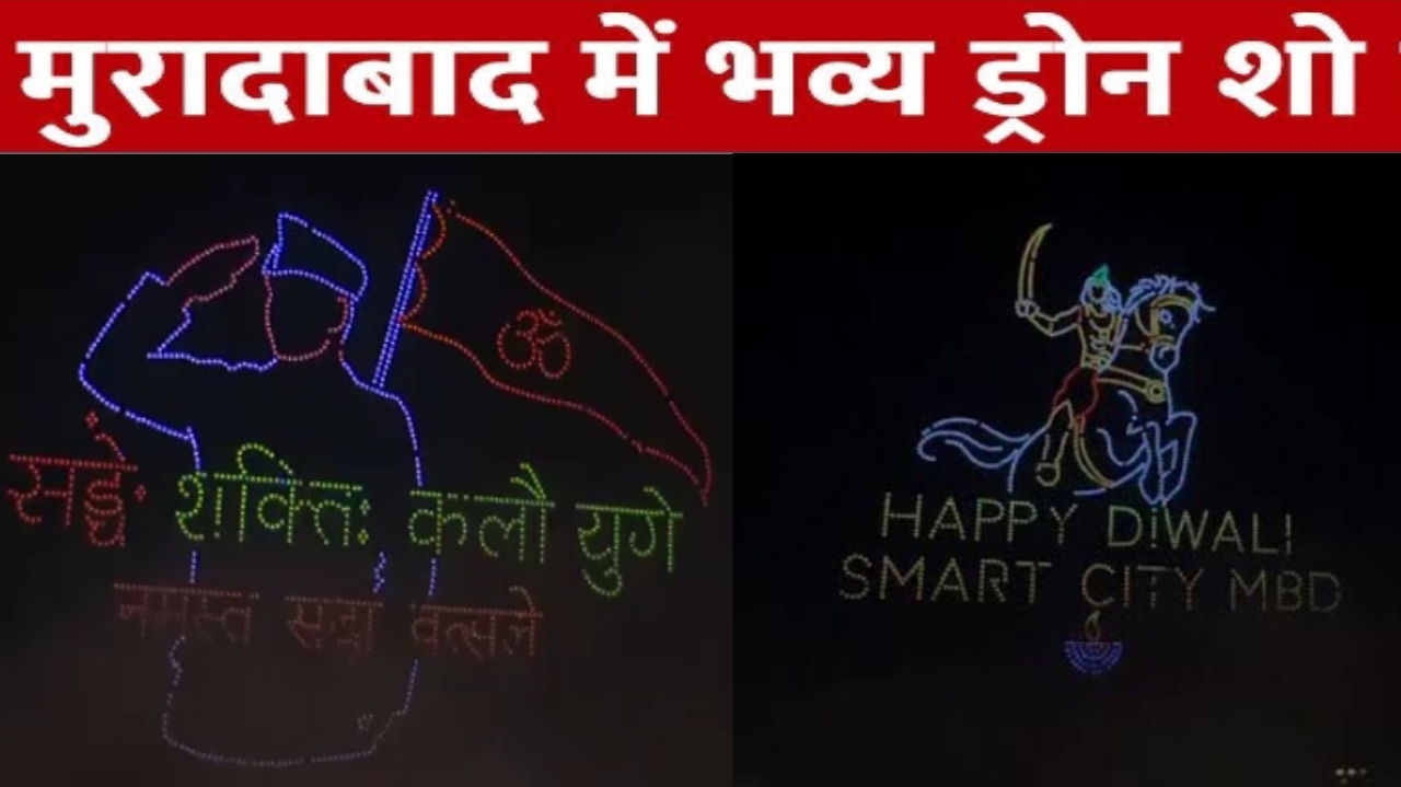 मुरादाबाद में नगर निगम द्वारा आयोजित दीपोत्सव में सबसे बड़ा आकर्षण 1500 ड्रोन का शो रहा। इन ड्रोनों ने आसमान में एक साथ उड़ान भरकर भगवान श्रीराम के जीवन पर आधारित 'आकाशीय रामलीला' का प्रदर्शन किया। दर्शक पहली बार इस तकनीकी और अनोखे प्रदर्शन को देखकर मंत्रमुग्ध हो गए, पूरे वातावरण में 'जय श्रीराम' के उद्घोष गूंज उठे। ड्रोन शो में सिर्फ धार्मिक कथाएं ही नहीं, बल्कि 'राम-रावण युद्ध', 'ऑपरेशन सिंदूर' और सेना से जुड़े दृश्यों के साथ-साथ स्वच्छता, सामाजिक एकता और महिला सशक्तिकरण जैसे सामयिक विषयों पर भी आकृतियां बनाकर दर्शकों को सोचने पर मजबूर किया गया। ड्रोन शो की समाप्ति के बाद भव्य आतिशबाजी ने रात के आकाश को रंगों से भर दिया। इस अद्भुत तकनीकी प्रस्तुति को देखकर हजारों की भीड़ ने जमकर सराहना की।