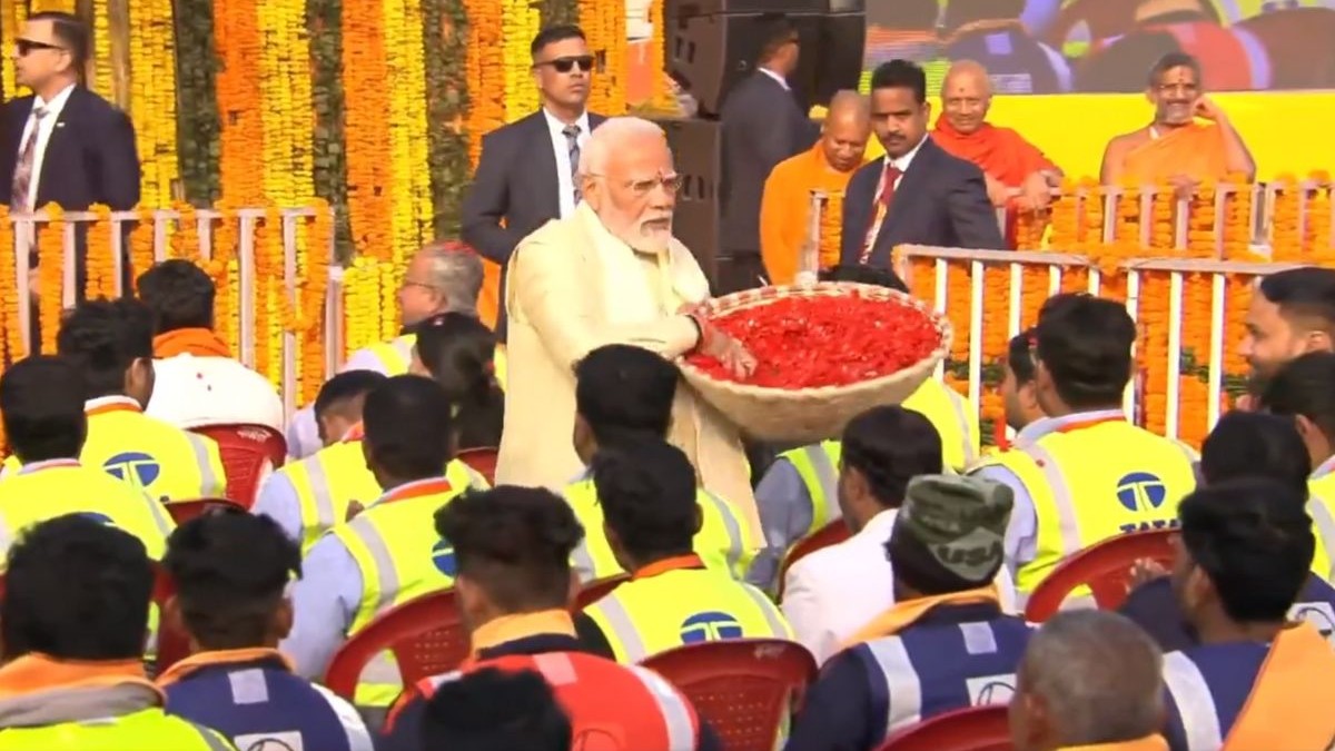 #WATCH | Prime Minister Narendra Modi showers flower petals on the workers who were a part of the construction crew at Ram Temple in Ayodhya, Uttar Pradesh. pic.twitter.com/gJp4KSnNp6