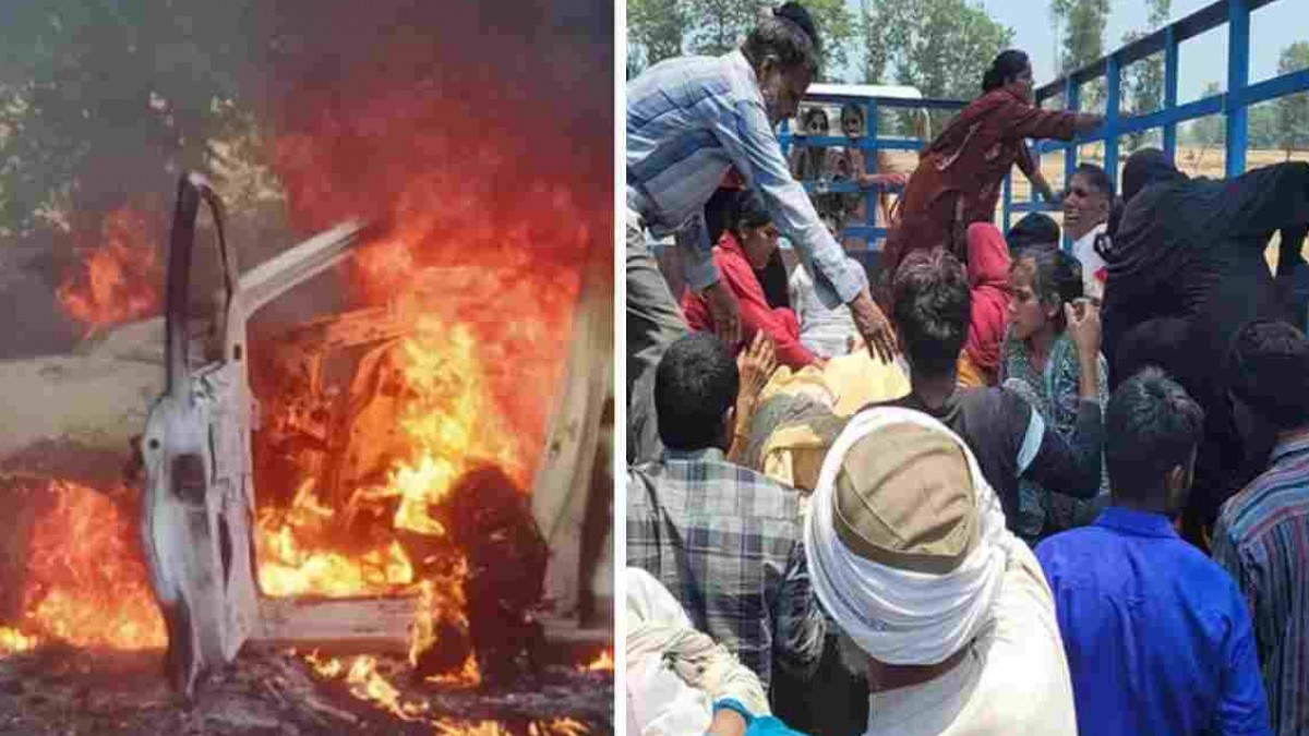 जिंदा जले दंपती: हरदोई में टक्कर के बाद कार में लगी आग, पीलीभीति में हाइटेंशन लाइन की चपेट में आए 21 जायरीन
