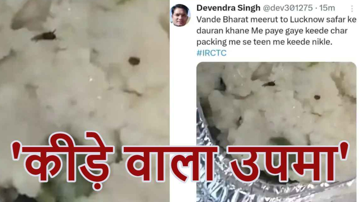 वंदे भारत ट्रेन मेरठ से चलकर लखनऊ जाती है। मेरठ के बाद मुरादाबाद, बरेली और फिर लखनऊ में इसका स्टापेज है। ट्रेन सोमवार सुबह मेरठ से चली, और मुरादाबाद और बरेली के बीच यात्रियों को नाश्ता सर्व किया गया। नाश्ते में सूजी का उपमा दिया गया। जैसे ही उपमा खोला तो उसमें कीड़े मिले। एक यात्री ने तुरंत वीडियो बनाकर सोशल मीडिया पर शेयर कर दिया।