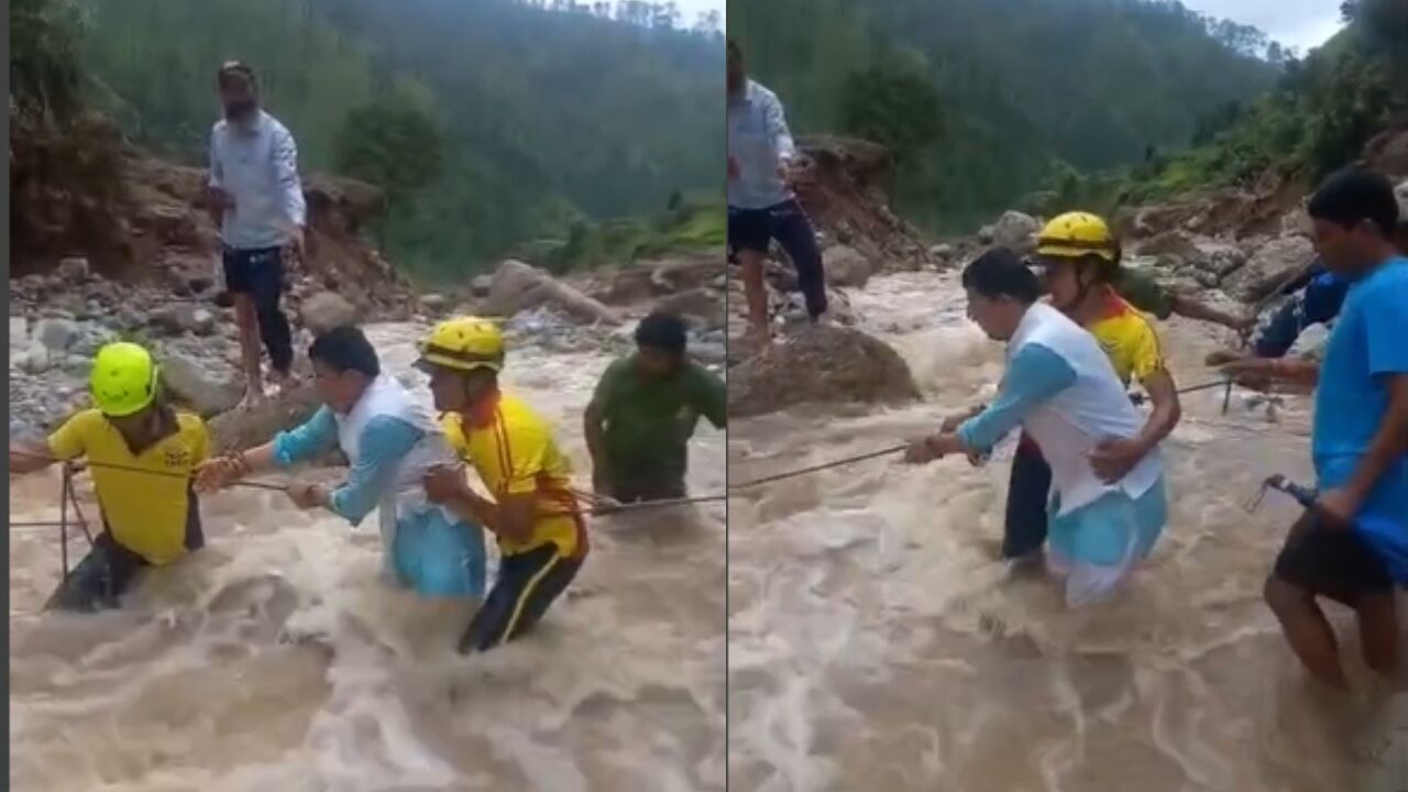 उत्तराखंड: बागेश्वर के पौंसारी गांव में बाढ़, गधेरा पार करते विधायक सुरेश गढ़िया।