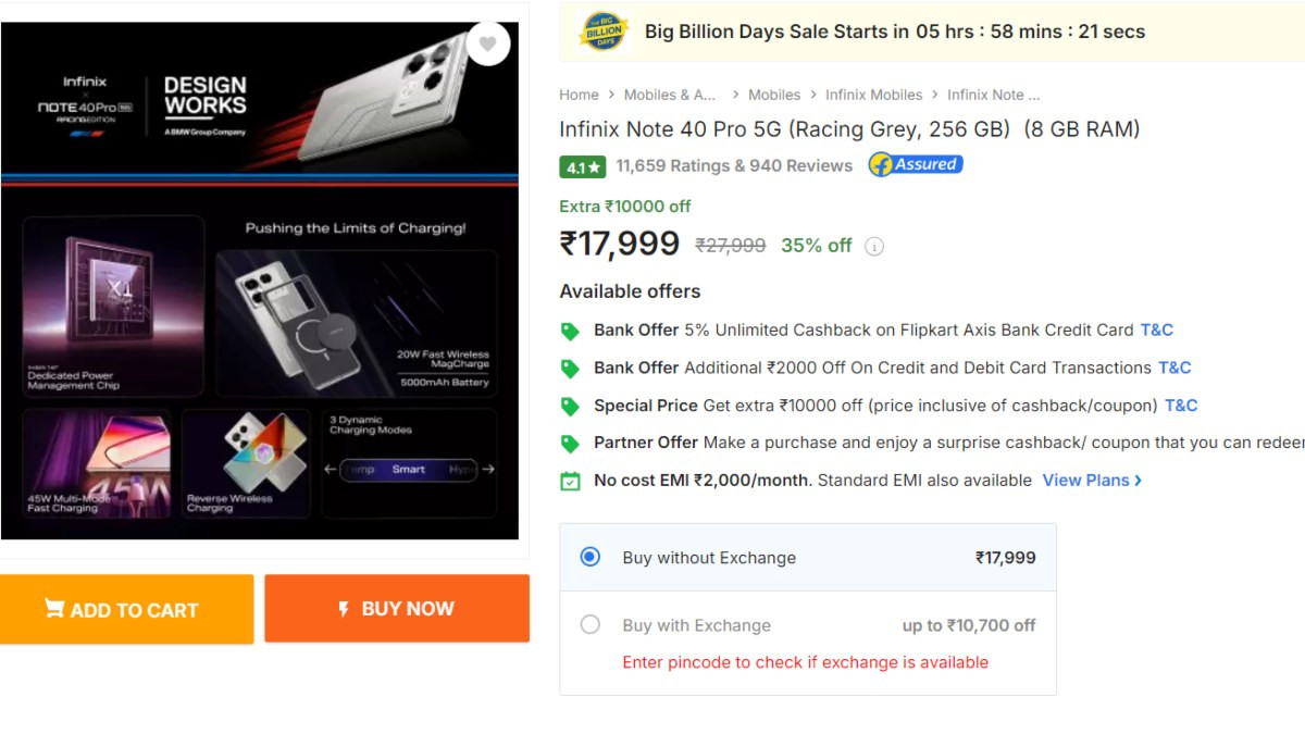 Big Billion Days Sale 2024 लाइव होने से पहले फ्लिपकार्ट की साइट पर Infinix Note 40 Pro 5G स्मार्टफोन 12 हजार रुपए सस्ते में मिल रहा है। यह फोन 108MP कैमरा के साथ आता है।