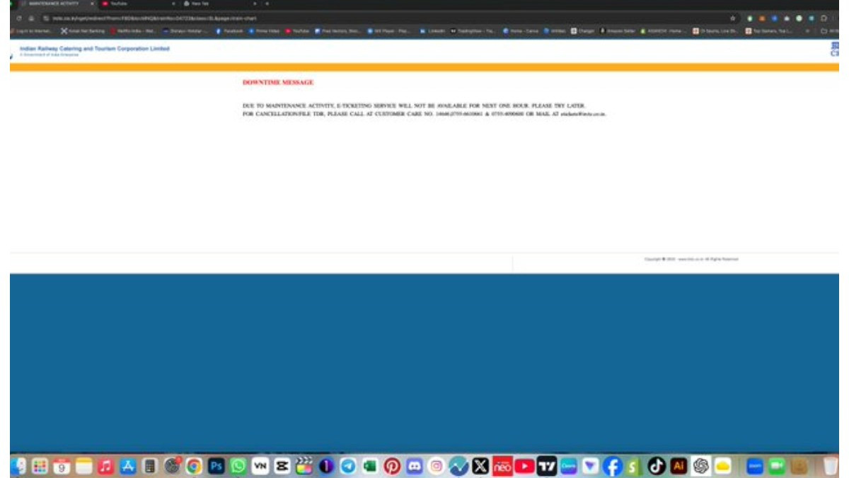 IRCTC DOWN: भारतीय रेलवे की ऑनलाइन टिकट बुकिंग सेवा IRCTC आज सुबह से ही ठप हो गई है, जिससे देशभर के यात्रियों को बड़ी परेशानी का सामना करना पड़ रहा है। लगभग दो घंटे से सेवा में रुकावट आई हुई है, और यूजर्स को टिकट बुक करने में दिक्कत हो रही हैं। आईआरसीटीसी की वेबसाइट पर मैसेज मिल रहा है कि फिलहाल साइट पर मेंटेनेंस का काम चल रहा है। जिसके चलते अगले 1 घंटे तक यूजर्स कोई बुकिंग नहीं कर सकेंगे।