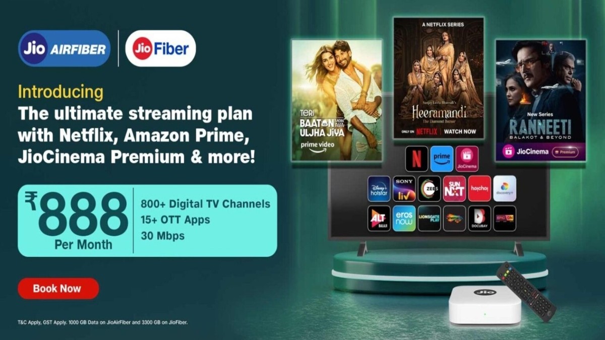 Jio Recharge Plan: भारत की सबसे बड़ी टेलीकॉम कंपनी रिलायंस जियो ने जियोफाइबर और जियोएयरफाइबर के लिए नया ब्रॉडबैंड प्लान पेश कर दिया है। नया प्लान खासतौर पर उन ग्राहकों के लिए ज्यादा फायदेमंद है, जो OTT पर फिल्में, वेबसीरीज और टीवी शोज देखना पसंद करते हैं। यह नया प्लान 888 रुपए प्रति महीने के साथ आता है यानी आपको इस प्लान का लाभ लेने के लिए कम से कम 888 रुपए का रिचार्ज कराना होगा।
