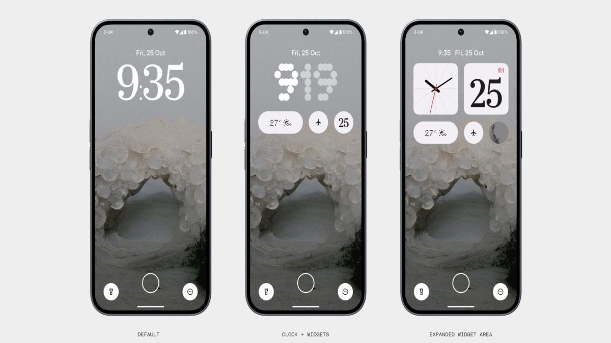 Nothing OS 3.0 में खास बात होगी कि इसमें लॉक स्क्रीन कस्टमाइजेशन के लिए कई ऑप्शन्स को शामिल किया जाएगा। इसमें यूजर्स को तीन अलग-अलग स्क्रीन स्टाइल लॉक के ऑप्शन मिलेंगे, जिसमें डिफॉल्ट, क्लॉक+विजेट्स और एक्सपैंडेड विजेट एरिया शामिल है। अपडेटेड फीचर के डिफॉल्ट स्टाइल में सिर्फ टाइम और डेट दिखाई देगी। वहीं क्लॉक+विजेट्स स्टाइल में यूजर्स अपनी पसंद की विजेट्स को एड कर सकेंगे। जबकि एक्सपैंडेड एरिया के अंदर उपयोगकर्ता और भी ज्यादा विजेट्स को जोड़ सकेंगे।