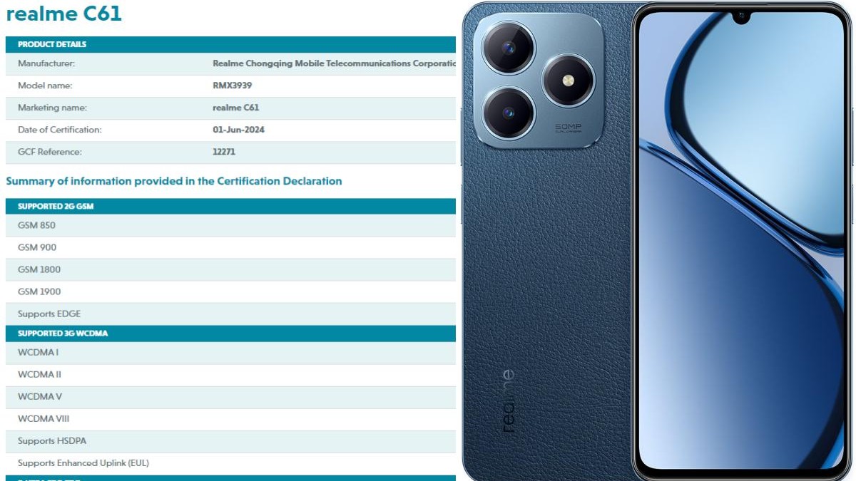 स्मार्टफोन मॉडल नंबर RMX3939 के साथ GCF लिस्टिंग पर दिखाई दिया है। हालांकि, लिस्टिंग से फोन के आधिकारिक नाम या स्पेसिफिकेशन का पता नहीं चलता है, लेकिन NBTC और इंडोनेशिया टेलीकॉम डेटाबेस में इस मॉडल नंबर को Realme C63 से जोड़ा गया है।