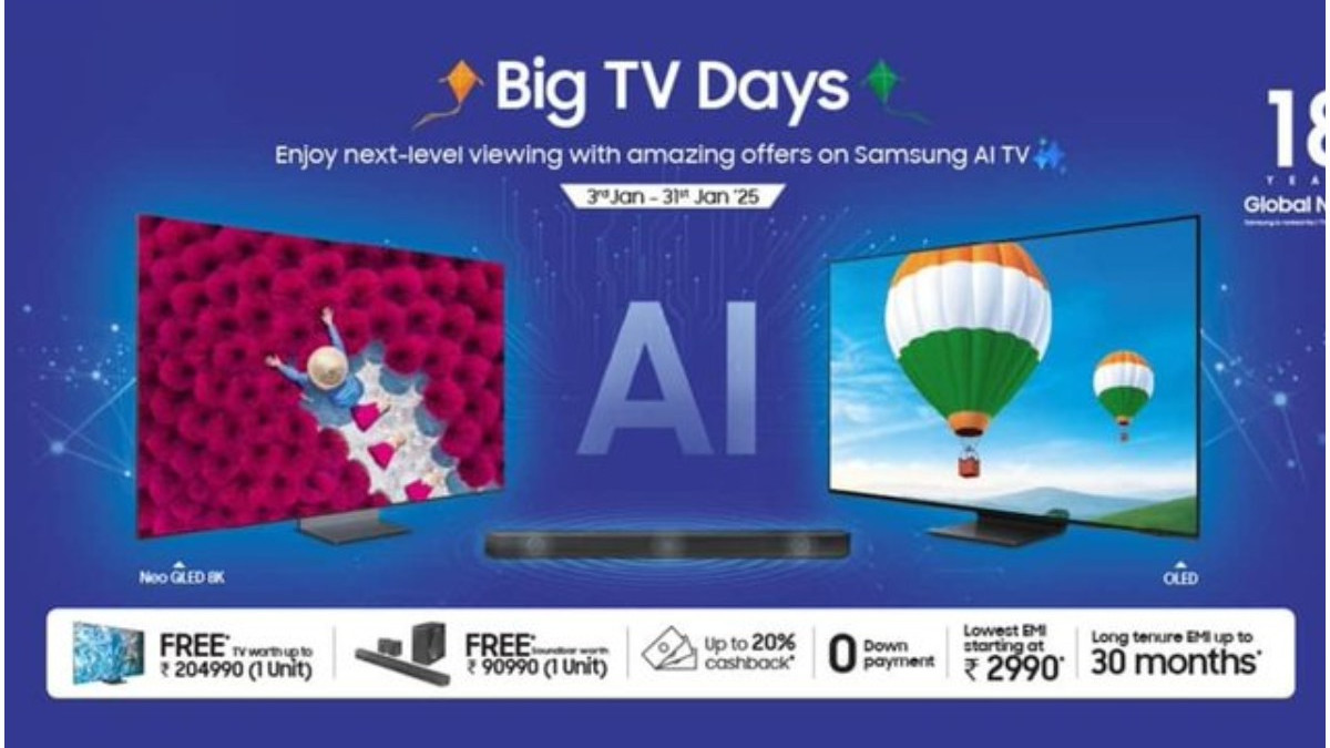 Samsung 'Big TV Days' सेल: प्रीमियम टीवी पर मिल रहा 20% तक का कैशबैक और नो-कॉस्ट EMI ऑप्शन; देखें डिटेल