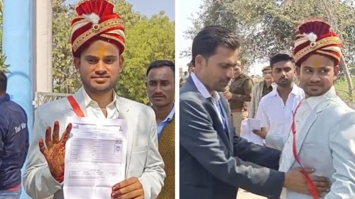 Groom arrives with baraat For Exam: उत्तर प्रदेश के महोबा में पुलिस भर्ती परीक्षा के दौरान एक दूल्हा भी परीक्षा देने के लिए पहुंच गया। हाथों में मेहंदी, सूट-पैंट और सिर पर दूल्हे वाली पगड़ी पहने एक युवक परीक्षा सेंटर पर नजर आया। उसे जिसने भी देखा हैरान रह गया। यूपी पुलिस कॉन्स्टेबल भर्ती के लिए युवक काफी वक्त से तैयारी कर रहा था। एक्ज़ाम के दिन ही शादी होने पर युवक का ज़ज्बा शादी पर भारी पड़ता दिखा और वो बारातियों के साथ ही एक्ज़ाम देने परीक्षा सेंटर पर पहुंच गया।