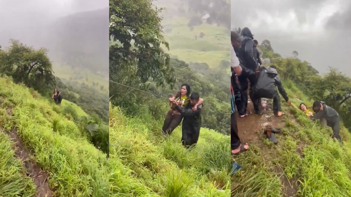 वीडियो में देखा जा सकता है कि कैसे महिला को सुरक्षाकर्मियों द्वारा रस्सी के माध्यम से बाहर निकाला जा रहा है। इस दौरान महिला काफी थक चुकी होती है, फिर भी काफी मशक्कत के बाद बारिश के बीच उसे खड़ी खाई से सुरक्षित निकाल लिया गया। इसके बाद नजदीकी अस्पताल में इलाज के लिए ले जाया गया।