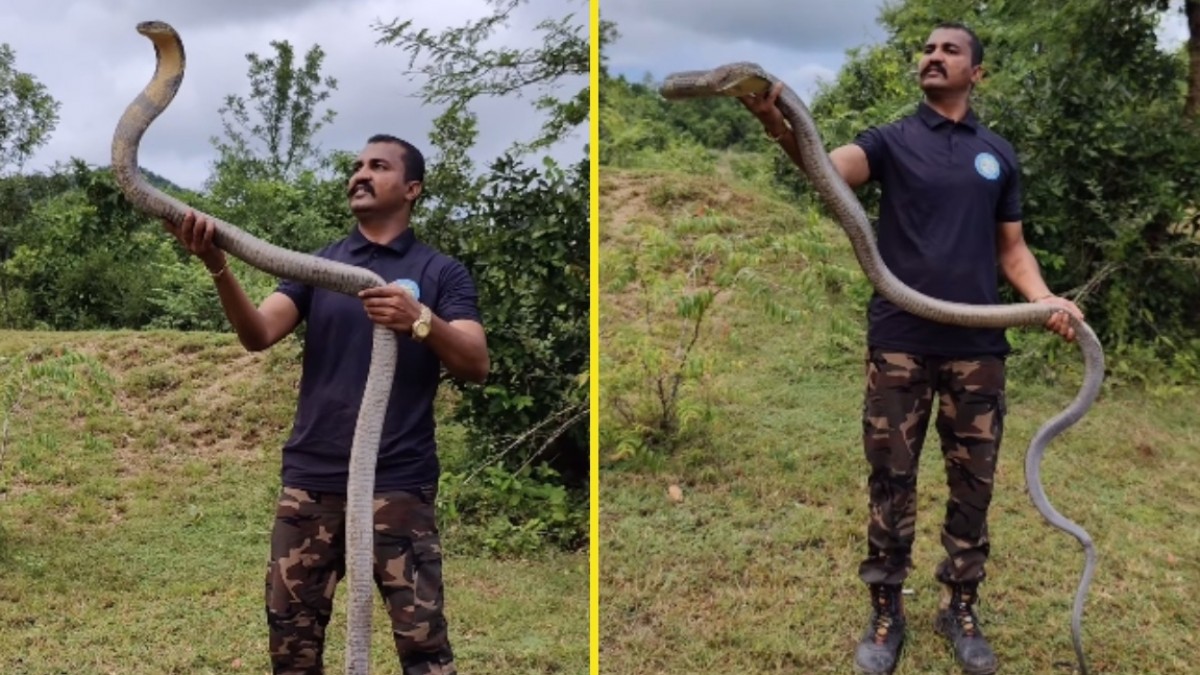 King Cobra Video : सांप का नाम सुनते ही अच्छों-अच्छों को डर लगने लगता है। सच में सामने सांप आ जाए तो सिट्टी-पिट्टी गुम हो जाती है। सोशल मीडिया पर सांप का रेस्क्यू करने वाले कई वीडियो वायरल होते हैं। वहीं, कुछ लोग ऐसे भी होते हैं, जिनके लिए सांप को पकड़ना उनके बाएं हाथ का खेल होता है। ऐसे लोगों को हम सर्पमित्र भी कहते हैं।