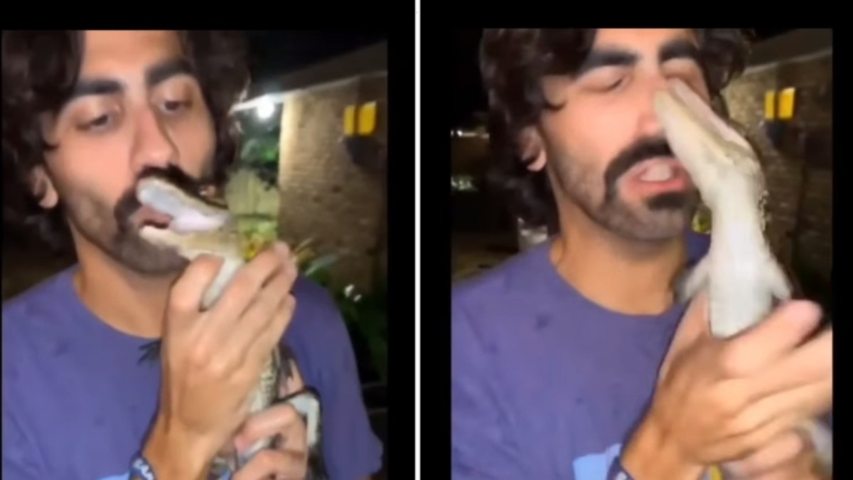 Alligator Bite On Man Nose : ऐसा ही एक वीडियो इन दिनों सोशल मीडिया पर वायरल हो रहा है, जिसमें एक शख्स अजीबोगरीब तरह की हरकत करते हुए दिखाई दे रहा है। वह एक मगरमच्छ के बच्चे को हाथ में पकड़कर किस करने की कोशिश कर रहा है। इसी दौरान उस शख्स के साथ एक हादसा हो जाता है, जिसमें व्यक्ति की नाक से खून बहने लगता है। यह वीडियो सोशल मीडिया पर वायरल हो रहा है।