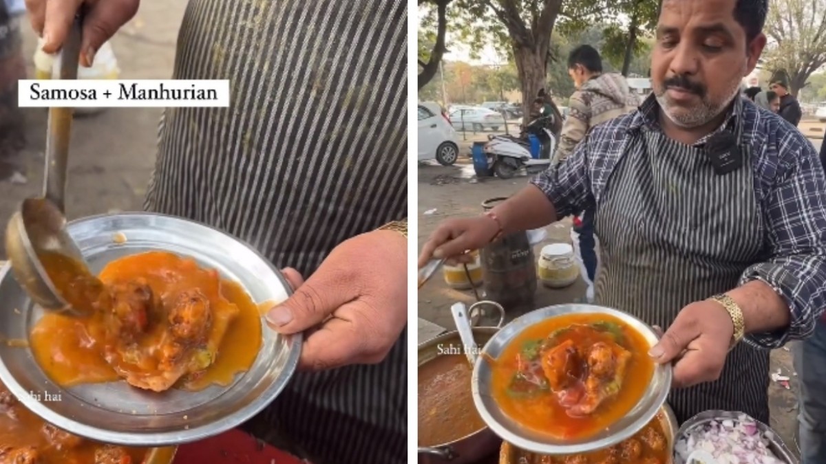 क्रेज़ी करने वाला कॉम्बिनेशन: समोसे के ऊपर मंचूरियन की टॉपिग, 20 रुपये में धड़ल्ले से बिक रही डिश, देखें VIDEO