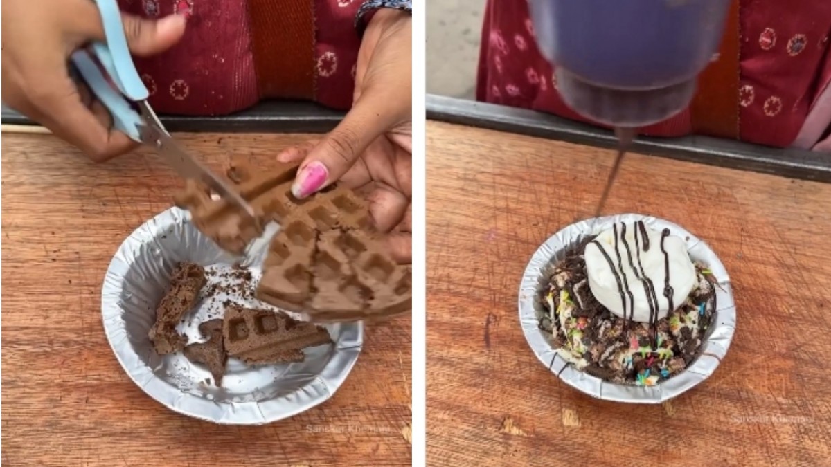 इसके बाद उस पर भेल और पापड़ी चाट को सजाया गया। इसके बाद वाफेल के टुकड़ों को दो तरह के चॉकलेट सिरप, स्प्रिंकल्स, वेनिला आइसक्रीम के स्कूप और आखिर में टॉप पर चॉकलेट चिप्स से सजाया गया। वाफेल भेल बनाने का ये तरीका नेटिजंस में काफी वायरल हो रहा है।