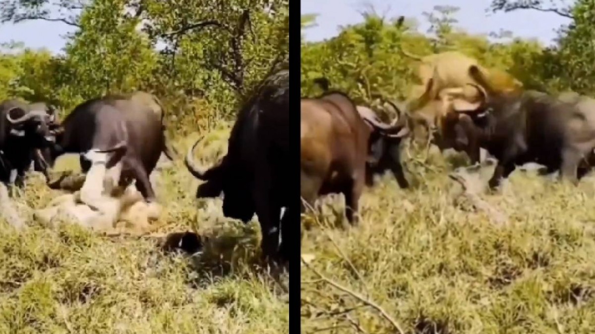 इसी बीच एक भैंस गुस्से में आती है और अपने सींग से शेर को उठाकर पटकने की कोशिश करती है। इसके बाद तो अन्य भैंसें भी उस पर टूट पड़ती हैं। इस दौरान शेर अपनी जान बचाकर वहां से भागने की कोशिश करता है, लेकिन भैंसों को झुंड उसे भागने ही नहीं देता, भैसें दौड़ा-दौड़ाकर उसे मारती और पटकती नजर आती हैं। मानो शेर की सामत आ जाती है। भैंसें मिलकर शेर पर हमला कर देते हैं। शेर को अपने सिंगों से उठा देते हैं और बार-बार जमीन पर पटक देते हैं। शेर को जंगली भैंसे जमकर उछालते हैं।