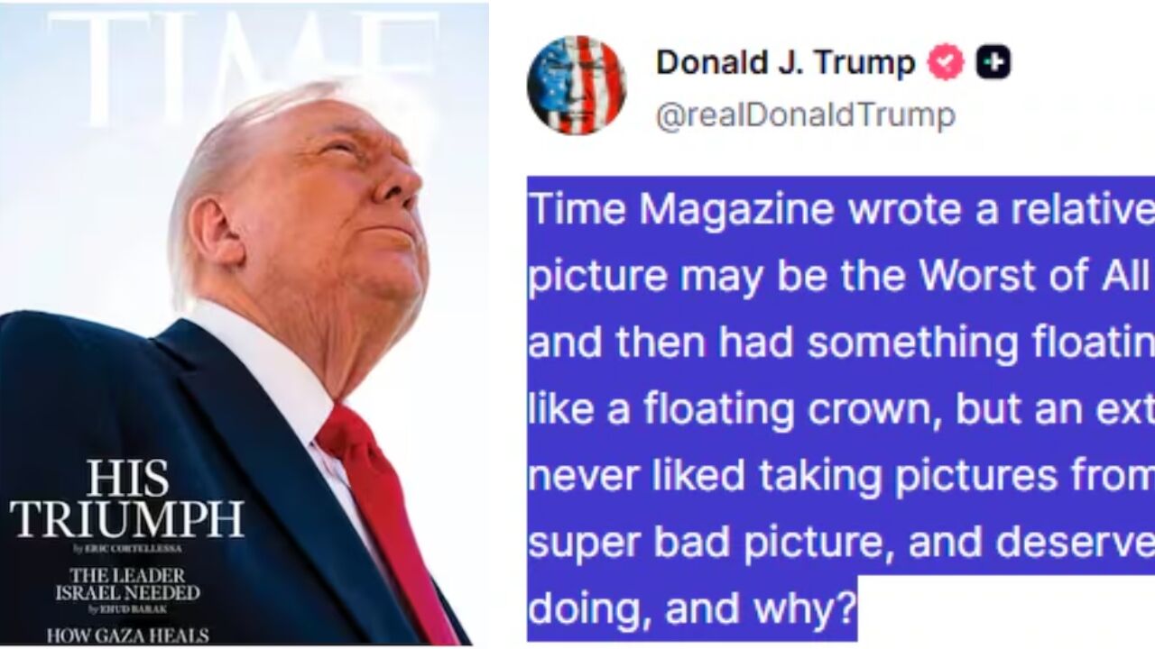 ट्रंप ने अपने सोशल मीडिया प्लेटफ़ॉर्म ट्रुथ सोशल पर लिखा “टाइम मैगज़ीन ने मेरे बारे में अच्छी खबर लिखी है, लेकिन यह तस्वीर वाकई भयानक है। उन्होंने मेरे बाल गायब कर दिए और ऊपर कुछ अजीब तैरता हुआ दिखाया। नीचे से ली गई तस्वीरें मुझे कभी पसंद नहीं थीं, यह अब तक की सबसे खराब तस्वीर है!”