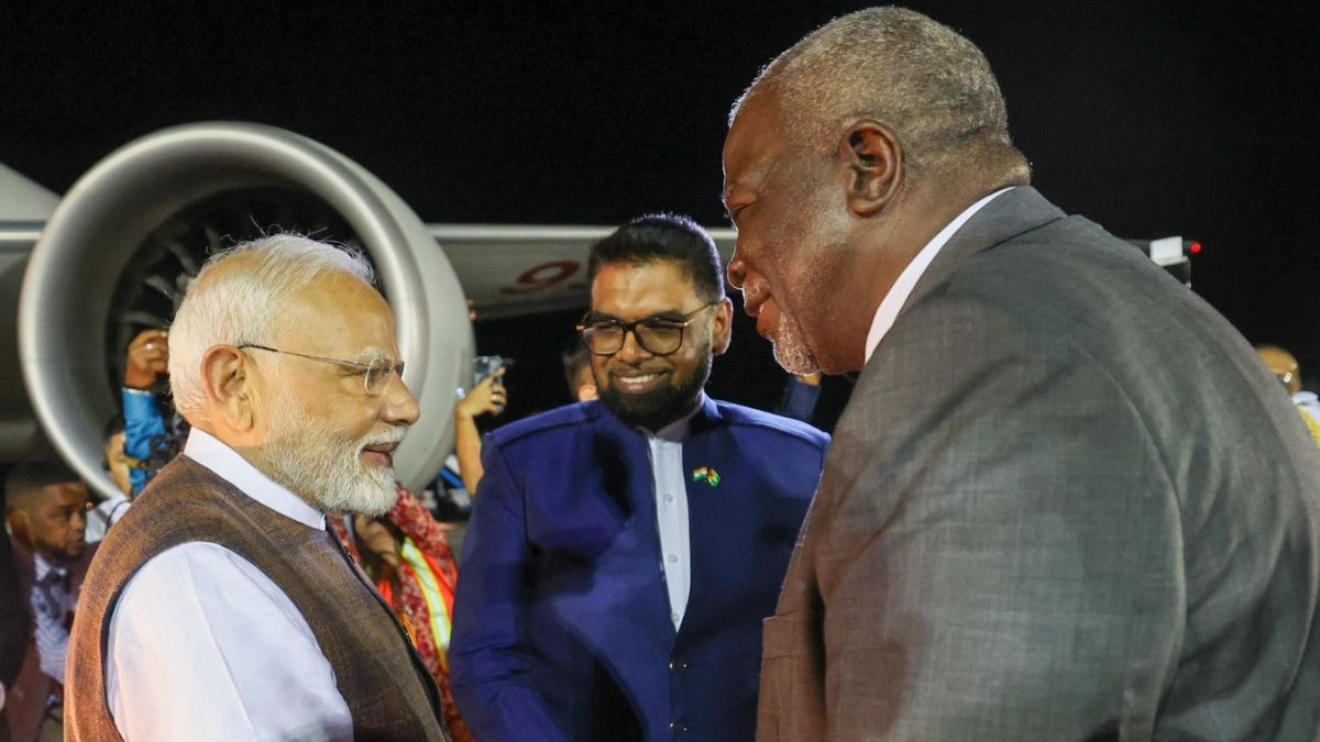 गुयाना पहुंचे PM मोदी: राष्ट्रपति और प्रधानमंत्री ने प्रोटोकॉल तोड़कर किया स्वागत; 3 अंतरराष्ट्रीय सम्मानों से होंगे सम्मानित
