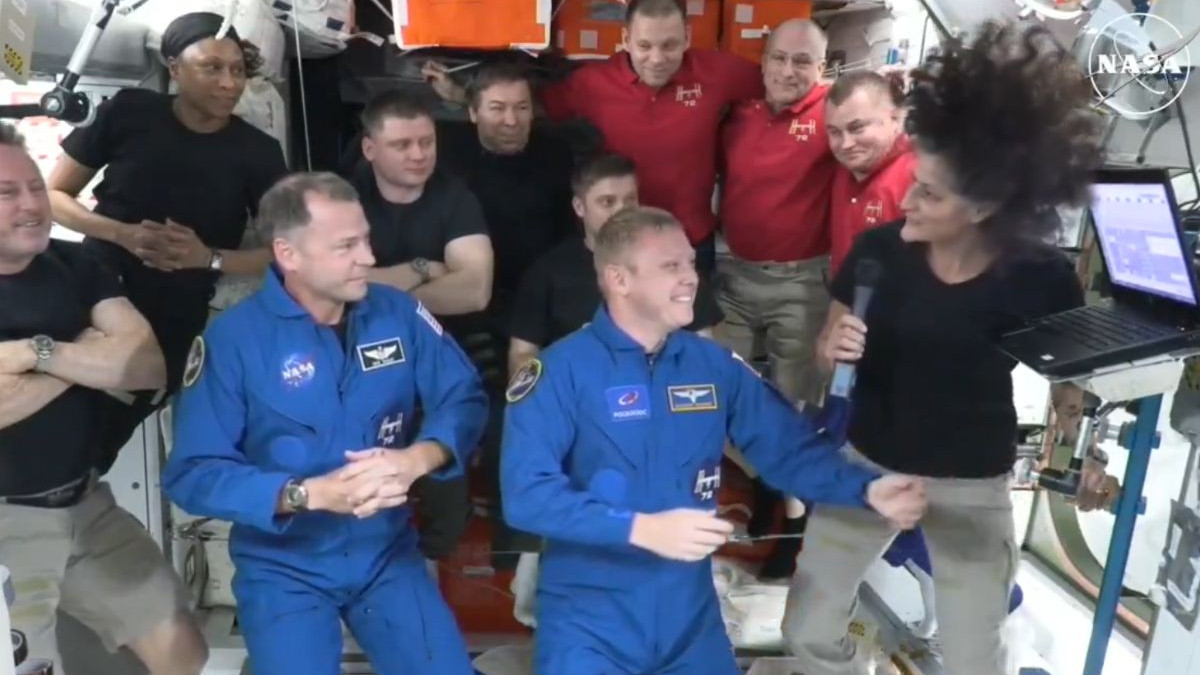 The Expedition 72 crew welcomed #Crew9, @NASAAstronauts Nick Hague, the Crew 9 commander and cosmonaut Aleksandr Gorbunov, the crew 9 mission specialist, after their flight aboard the @SpaceX Dragon spacecraft. pic.twitter.com/pOa8sTQWDo