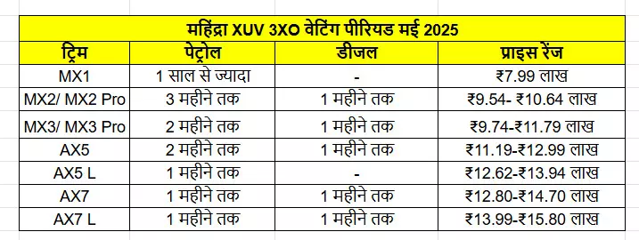 Mahindra XUV 3XO waiting period in May 2025: महिंद्रा की ऑल न्यू एंट्री लेवल XUV 3XO SUV की बाजार में डिमांड तेजी से बढ़ रही है। फाइनेंशिय ईयर 2025 में छोटी कॉम्पैक्ट SUV की बिक्री 1 लाख के आंकड़े को पार कर चुकी है। आमतौर पर, जैसे-जैसे डिमांड बढ़ती है, वैसे-वैसे वेटिंग पीरियड भी बढ़ता है। इस वजह से कंपनी अपनी SUV का प्रोडक्शन बढ़ाने के प्रयास में लगी हुई है। हालांकि, इसके बाद भी मई में XUV 3XO का वेटिंग पीरियड मार्च की तुलना में अधिकांश वैरिएंट के लिए दोगुना हो गया है। एंट्री-लेवल XUV 3XO MX1 वैरिएंट का वेटिंग पीरियड 1 साल से ज्यादा है।