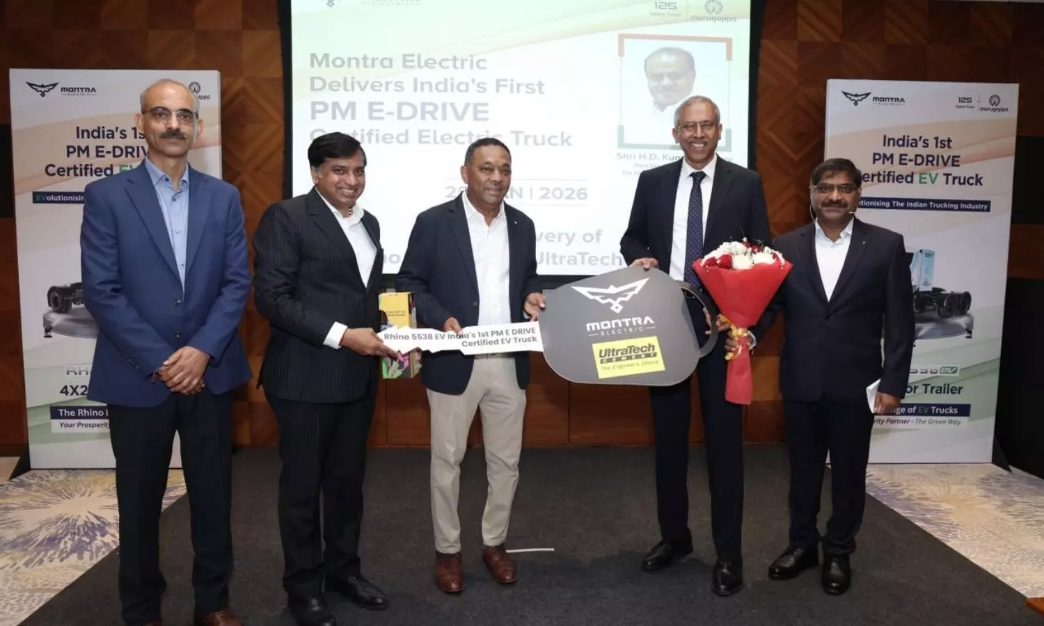 Montra Electric Rhino 5538 EV: भारत में स्वच्छ ऊर्जा और क्लीन मोबिलिटी के क्षेत्र में आज एक बड़ा अध्याय जुड़ गया है। मुरुगप्पा ग्रुप की कंपनी मॉन्ट्रा इलेक्ट्रिक ने देश का पहला 'पीएम ई-ड्राइव' (PM E-Drive) सर्टिफाईड हैवी-ड्यूटी इलेक्ट्रिक ट्रक बाजार में उतार दिया है। कंपनी इस महत्वपूर्ण सरकारी योजना के तहत प्रमाणन प्राप्त करने वाली भारत की पहली हैवी-ड्यूटी इलेक्ट्रिक ट्रक निर्माता बन गई है। इस ऐतिहासिक अवसर पर मॉन्ट्रा इलेक्ट्रिक ने अपना पहला सर्टिफाईड ट्रक, राइनो 5538 ईवी (Rhino 5538 EV), देश की अग्रणी सीमेंट निर्माता कंपनी अल्ट्राटेक सीमेंट लिमिटेड को सौंप दिया है।