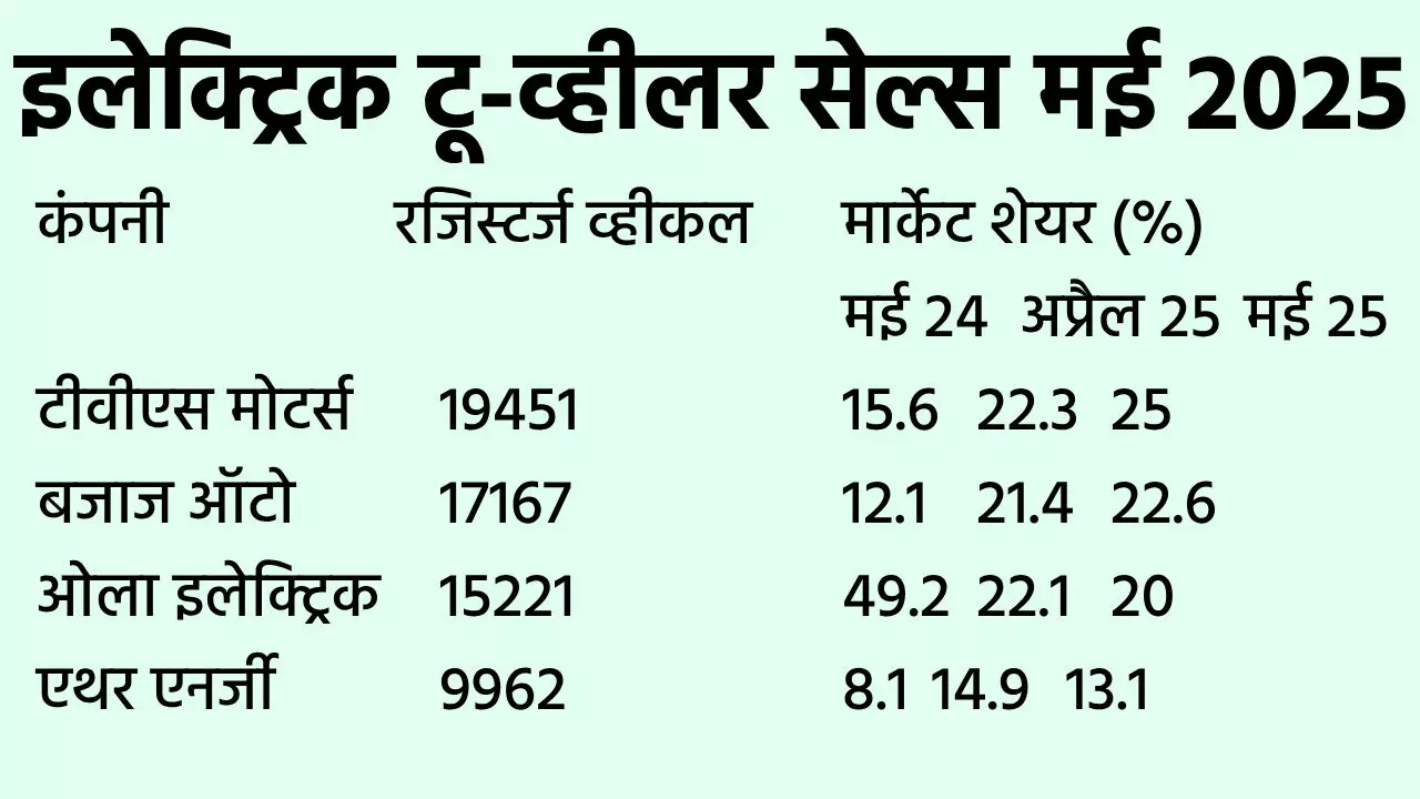 वाहन पोर्टल (26 मई, 2025 तक) के डेटा से पता चलता है कि टीवीएस मोटर 19,451 यूनिट के वाहन रजिस्ट्रेशन के साथ दौड़ में सबसे आगे है। इसके साथ ही, मई 2025 में इलेक्ट्रिक टू-व्हीलर सेगमेंट में टीवीएस की बाजार हिस्सेदारी 25% है। मई 2024 में रिपोर्ट की गई 15.6% बाजार हिस्सेदारी की तुलना में यह साल-दर-साल वृद्धि है। MoM भी सकारात्मक है, क्योंकि अप्रैल 2025 में बाजार हिस्सेदारी 22.3% थी।