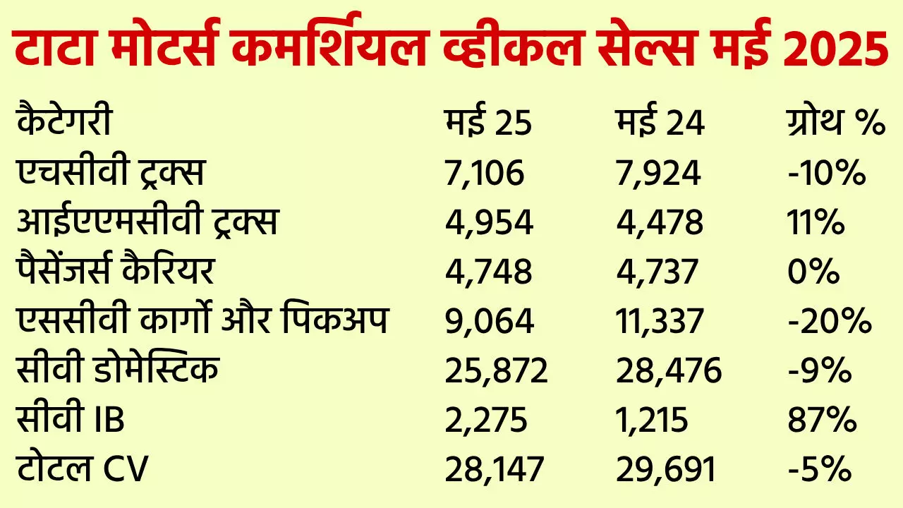 टाटा मोटर्स की कमर्शियल व्हीकल सेल्स की बात करें तो HCV ट्रक्स सेगमेंट में मई 2025 में 7,106 यूनिट बेचीं। जबकि मई 2024 में इसकी सेल्स 7,924 यूनिट की थी। यानी इसे 10% की ईयरली डिग्रोथ मिली। ILMCV ट्रक्स सेगमेंट में मई 2025 में 4,9546 यूनिट बेचीं। जबकि मई 2024 में इसकी सेल्स 4,478 यूनिट की थी। यानी इसे 11% की ईयरली ग्रोथ मिली। पैसेंजर्स कैरियर सेगमेंट में मई 2025 में 4,7486 यूनिट बेचीं। जबकि मई 2024 में इसकी सेल्स 4,737 यूनिट की थी। यानी इसे 0% की ईयरली ग्रोथ मिली।