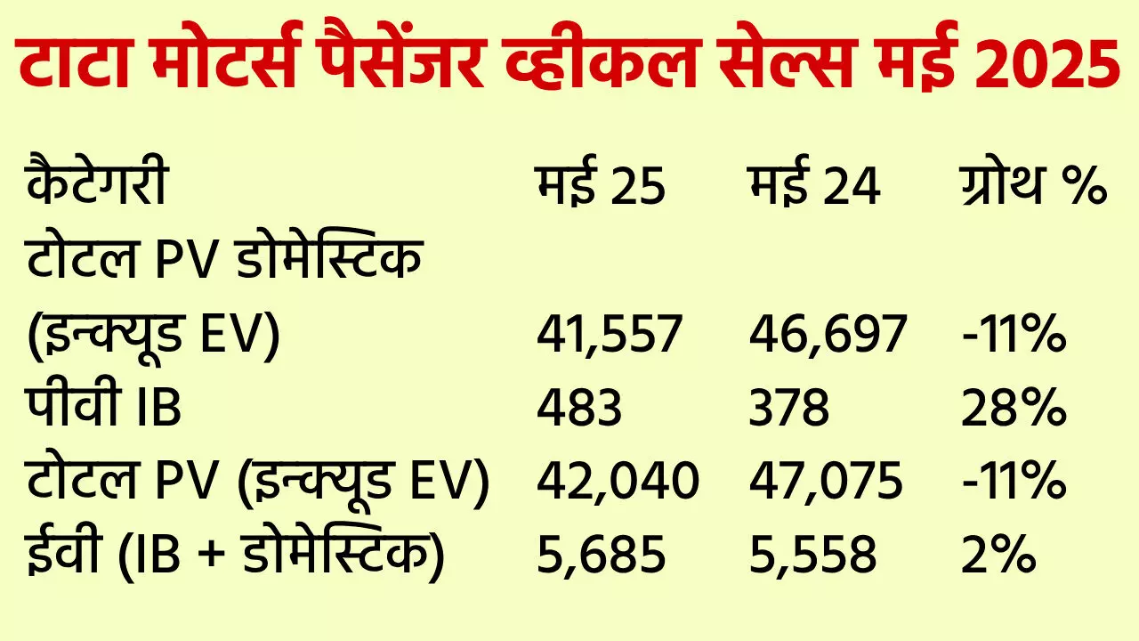 पैसेंजर व्हीकल सेल्स की बात करें तो टोटल PV डोमेस्टिक (इन्क्यूड EV) में मई 2025 में 41,557 यूनिट बिकीं। जबकि मई 2024 में इसकी 46,697 यूनिट बिकी थीं। यानी इसे 11% की डिग्रोथ मिली। PV IB में मई 2025 में 483 यूनिट बिकीं। जबकि मई 2024 में इसकी 378 यूनिट बिकी थीं। यानी इसे 28% की ग्रोथ मिली। टोटल PV (इन्क्यूड EV) में मई 2025 में 42,040 यूनिट बिकीं। जबकि मई 2024 में इसकी 47,075 यूनिट बिकी थीं। यानी इसे 11% की डिग्रोथ मिली। EV (IB + डोमेस्टिक) में मई 2025 में 5,685 यूनिट बिकीं। जबकि मई 2024 में इसकी 5,558 यूनिट बिकी थीं। यानी इसे 2% की ग्रोथ मिली।
