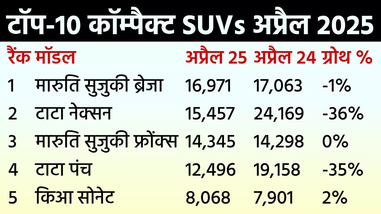 मारुति सुजुकी ब्रेजा की अप्रैल 2025 में 16,971 यूनिट बिकीं। जबकि अप्रैल 2024 में इसकी 17,063 यूनिट बिकी थीं। यानी इसे 1% की ईयरली डिग्रोथ मिली। टाटा नेक्सन की अप्रैल 2025 में 15,457 यूनिट बिकीं। जबकि अप्रैल 2024 में इसकी 24,169 यूनिट बिकी थीं। यानी इसे 36% की ईयरली डिग्रोथ मिली। मारुति सुजुकी फ्रोंक्स की अप्रैल 2025 में 14,345 यूनिट बिकीं। जबकि अप्रैल 2024 में इसकी 14,298 यूनिट बिकी थीं। यानी इसे मामूली ईयरली ग्रोथ मिली। टाटा पंच की अप्रैल 2025 में 12,496 यूनिट बिकीं। जबकि अप्रैल 2024 में इसकी 19,158 यूनिट बिकी थीं। यानी इसे 35% की ईयरली डिग्रोथ मिली। किआ सोनेट की अप्रैल 2025 में 8,068 यूनिट बिकीं। जबकि अप्रैल 2024 में इसकी 7,901 यूनिट बिकी थीं। यानी इसे 2% की ईयरली ग्रोथ मिली।