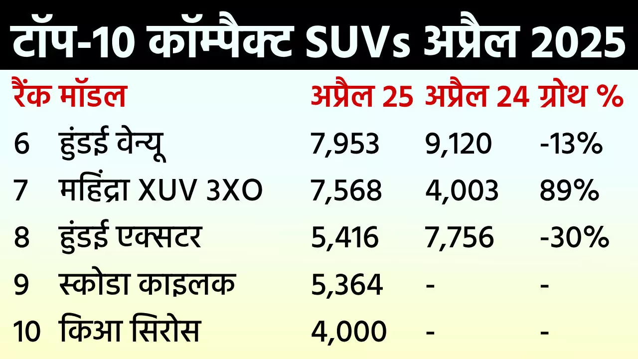 हुंडई वेन्यू की अप्रैल 2025 में 7,953 यूनिट बिकीं। जबकि अप्रैल 2024 में इसकी 9,120 यूनिट बिकी थीं। यानी इसे 13% की ईयरली डिग्रोथ मिली। महिंद्रा XUV 3XO की अप्रैल 2025 में 7,568 यूनिट बिकीं। जबकि अप्रैल 2024 में इसकी 4,003 यूनिट बिकी थीं। यानी इसे 89% की ईयरली ग्रोथ मिली। हुंडई एक्सटर की अप्रैल 2025 में 5,416 यूनिट बिकीं। जबकि अप्रैल 2024 में इसकी 7,756 यूनिट बिकी थीं। यानी इसे 30% की ईयरली डिग्रोथ मिली। स्कोडा काइलक की अप्रैल 2025 में 5,364 यूनिट बिकीं। किआ सिरोस की अप्रैल 2025 में 4,000 यूनिट बिकीं।