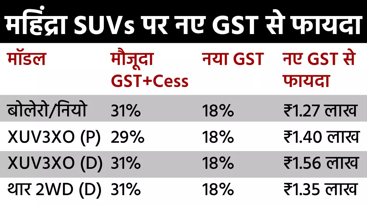 - बोलेरो और नियो पर पहले 31% (GST + सेस) लगता था, जो अब घटकर 18% हो गया है। यानी 1.27 लाख रुपए का फायदा मिलेगा।