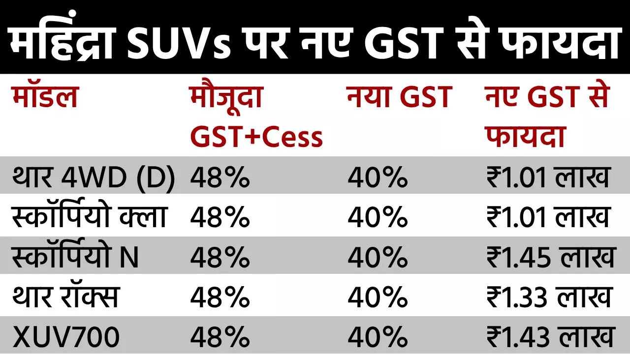 - स्कॉर्पियो क्लासिक पर पहले 48% (GST + सेस) लगता था, जो अब घटकर 40% हो गया है। यानी 1.01 लाख रुपए का फायदा मिलेगा।