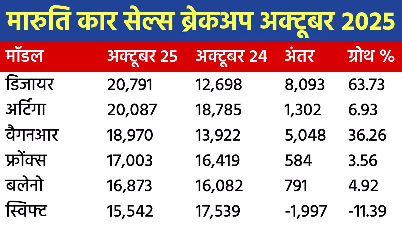 Maruti Sales Breakup October 2025: मारुति सुजुकी इंडिया ने अपनी अक्टूबर 2025 सेल्स का ब्रेकअप जारी कर दिया है। कंपनी के भारतीय पोर्टफोलियो में 17 मॉडल हैं। सियाज उसका 18वां मॉडल था, जिसे कंपनी अप्रैल में बंद कर चुकी है। कंपनी ने पिछले महीने 1,76,318 गाड़ियां बेचीं। जबकि अक्टूबर 2024 में 1,59,591 यूनिट बेची थीं। यानी मारुति को 10.48% की सालाना ग्रोथ मिली। कंपनी के लिए पिछले महीने सबसे ज्यादा बिकने वाली कार डिजायर रही। चलिए कंपनी की सेल्स ब्रेकअप को देखते हैं।