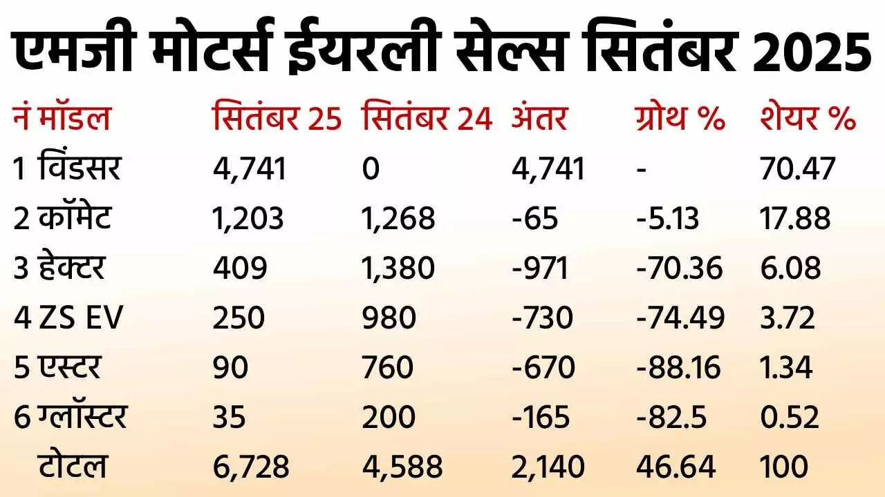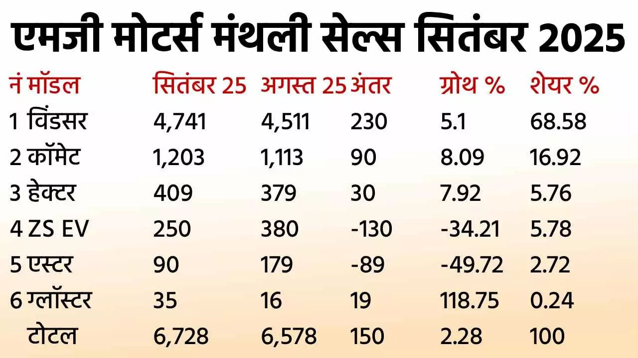 MG Sales Breakup September 2025: एमजी मोटर्स भारतीय बाजार में कुल 6 मॉडल बेच रही है। कंपनी टाटा मोटर्स के बाद इलेक्ट्रिक फोर-व्हीलर सेगमेंट की दूसरी सबसे बड़ी कंपनी भी है। विंडसर EV EV उसकी देश की सबसे ज्यादा बिकने वाली इलेक्ट्रिक कार है। इसमें उसके 3 ICE और 3 इलेक्ट्रिक मॉडल शामिल हैं। खास बात ये है कि कॉमेट EV देश की सबसे सस्ती इलेक्ट्रिक कार भी है। चलिए इसकी मॉडल वाइज सेल्स देखते हैं।