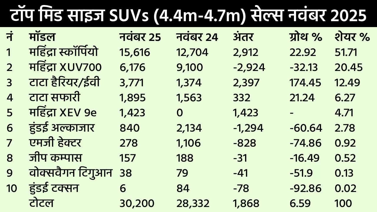 Mid Size SUV Sales November 2025: देश के मिड साइज SUV सेगमेंट (4.4 मीटर से 4.7 मीटर) के टॉप-10 मॉडल की लिस्ट सामने आ गई है। इस सेगमेंट में महिंद्रा स्कॉर्पियो एक बार फिर नंबर-1 कार बनकर सामने आई। टॉप-10 कारों की लिस्ट में महिंद्रा के 3 मॉडल, टाटा के 2 मॉडल, हुंडई के 2 मॉडल, एमजी का एक मॉडल, वोक्सवैगन का एक मॉडल और जीप का एक मॉडल शामिल रहा। जबकि स्कॉर्पियो को 15 हजार से ज्यादा ग्राहक मिले। ऐसे में आप भी इस सेगमेंट की कोई SUV खरीदने का प्लान बना रहे हैं तब एक बार इस लिस्ट पर नजर डाल लें।